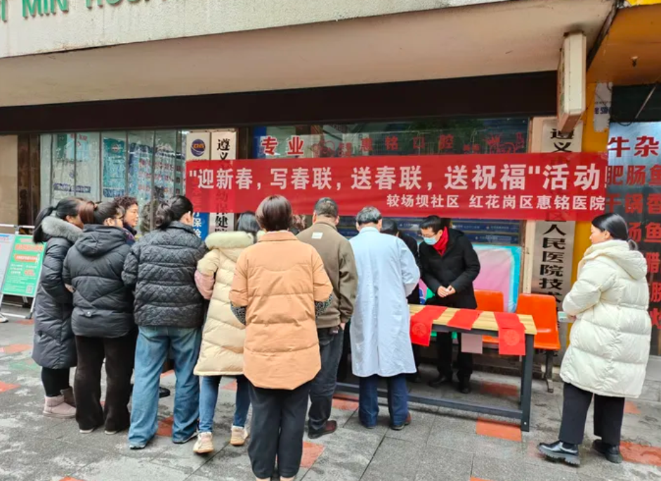 墨香暖社区 医患情更浓 | 惠铭医院联合较场坝社区开展迎新春送春联活动 岁末天寒,年味渐浓。在这辞旧迎新的美好时刻,红花岗区惠铭医院与较场坝社区携手,将传统佳节的温暖触达社区的每一个角落,让冰冷的冬日因人与人之间的关怀而变得热气腾腾。